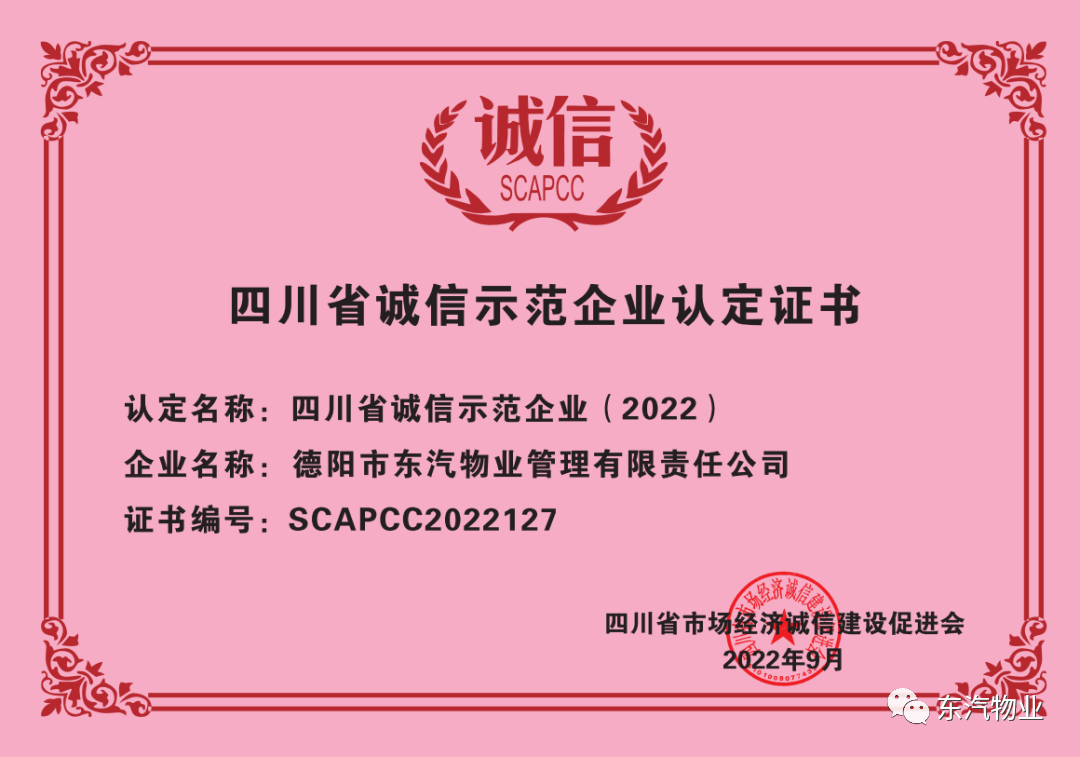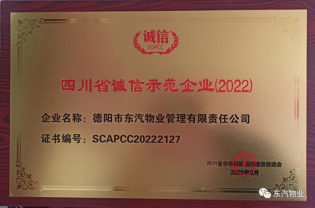2022年,由四川省市場經濟誠信建設促進會主辦,四川省省經濟和信息化廳、省商務廳、省工商業(yè)聯(lián)合會、省政府政務服務和公共資源交易服務中心指導的“四川省企業(yè)誠信示范”活動開啟。東汽物業(yè)與許多省內知名企業(yè)“同臺競技”,經過推薦申報、提交資料、初評,再到網絡投票及省級評審組專家線上和現(xiàn)場評審等環(huán)節(jié),東汽物業(yè)憑借實力成功獲得“四川省誠信示范企業(yè)”殊榮。